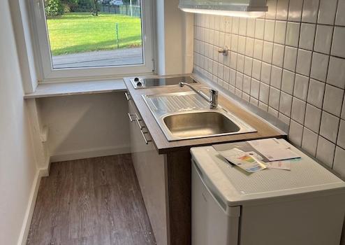 Die Wände sind frisch weiß gestrichen und der pflegeleichte Vinyl Fußboden ist neu verlegt.