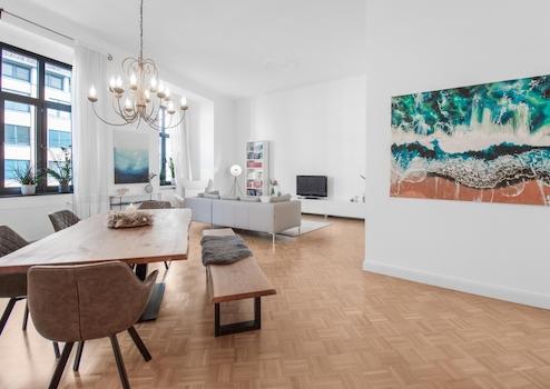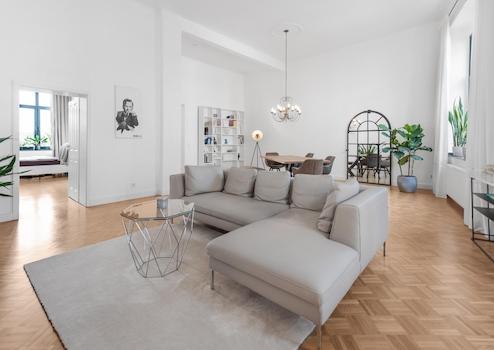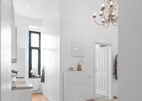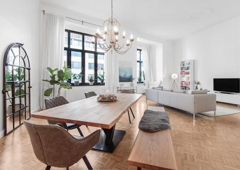 Kernsaniertes 2-Zimmer-Loftjuwel in Düsseldorf-Grafenberg – 97 m² mit 4 m Deckenhöhe, Stuck und Kronleuchtern.