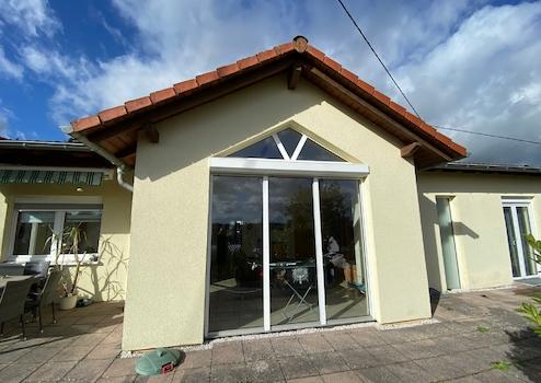Hohe Fensterelemente sorgen hier für ein helles, freundliches Ambiente und eröffnen den Blick ins Grüne.