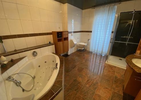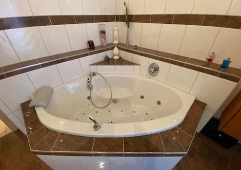Ein besonderes Highlight ist die Badeoase zum Träumen: eine elegante Kombination aus Badewanne, und Dusche in stilvollen Materialien und liebevollen Details –