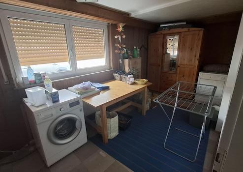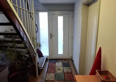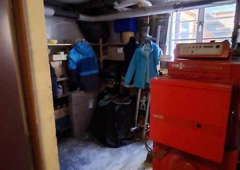 Im großzügigen Eingangsbereich befindet sich ein Kinderzimmer mit Toilette, der Heizungsraum mit einer jährlich gewarteten Ölheizung von 1998, ein kleines Duschbad und der Eingang zum Kellerraum plus Garage.