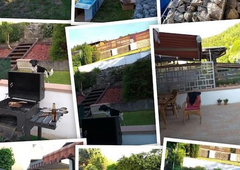 Auf dem oberen Teil, mit Zugang zur Straße, befindet sich eine Holzdielenterrasse mit Platz für ein 4x4m Pool und eine Liegewiese.