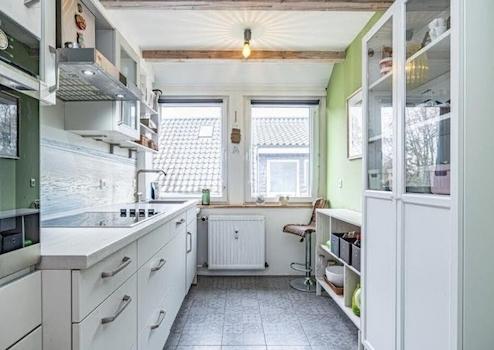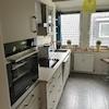 Die Einbauküche ( von 2018 ) verfügt über eine Cerankochplatte , einem Backofen auf Arbeitshöhe, sowie einem Geschirrspüler.