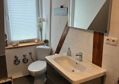 Das Badezimmer wurde 2021 komplett neu gemacht und verfügt über eine ebenerdigen Dusche. Es wurde mit grauem Feinsteinzeug verlegt. Das große Fenster ermöglicht viel Tageslicht und eine gute Durchlüftung.