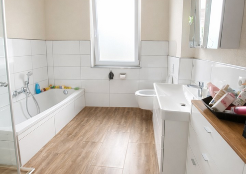 Das Badezimmer ist geschmackvoll ausgestattet und verfügt über moderne Sanitärobjekte sowie eine zeitgemäße Gestaltung, die Funktionalität und Ästhetik harmonisch verbindet.