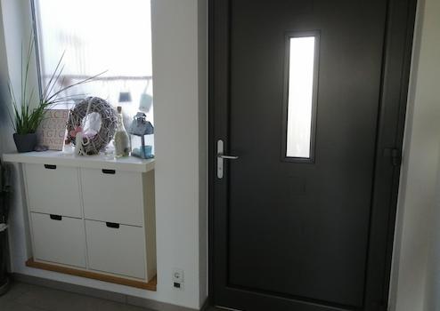 Der Zugang zum Haus ist durch eine Diele abgetrennt. Von dort aus kommen Gäste auch gleich ins Gäste-WC mit integrierter Dusche.