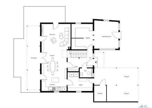 Im Norden befindet sich noch ein Anbau (ca. 16 m²) mit eigenem Eingang, welcher zum Beispiel als Büro oder kleiner Laden/Geschäftsraum genutzt werden kann.