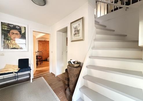 Über eine charmante Holztreppe gelangt man in das Obergeschoss, das mit zwei geräumigen Schlafzimmern viel Flexibilität für Paare oder kleine Familien bietet. Der großzügige Flurbereich auf dieser Ebene bietet ausreichend Platz, um ihn zum Beispiel als Homeoffice, Leseecke oder gemütlichen Arbeitsplatz zu nutzen. Praktische Abstellmöglichkeiten runden diese Ebene ab.