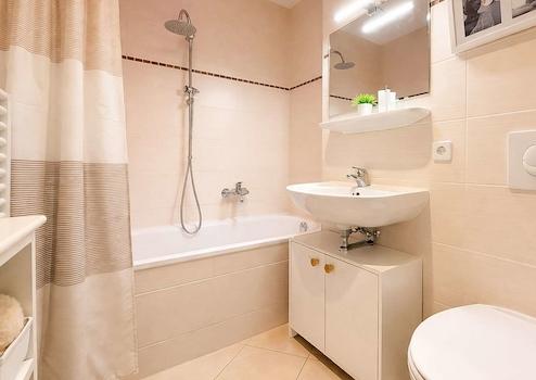 Das Badezimmer ist mit einer Badewanne, einem Waschbecken, einem WC sowie einem Handtuchheizkörper ausgestattet. Moderne und zeitlose Fliesen sorgen hier für ein gepflegtes und ansprechendes Gesamtbild.