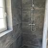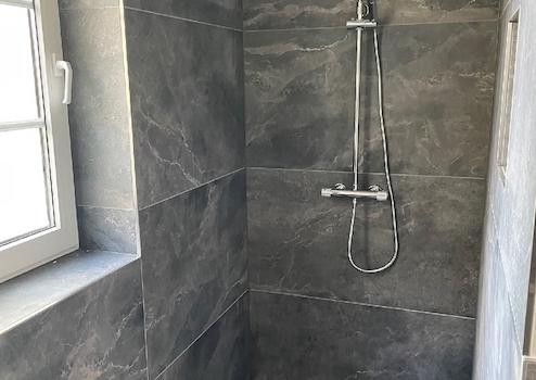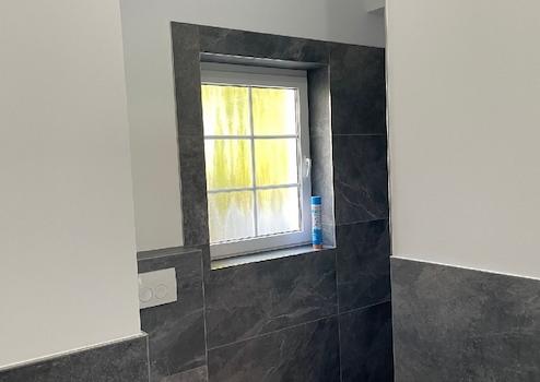 das Bad mit großer, bodengleicher Dusche, das separate WC und das ca 50 m² große Wohnzimmer. Die Küche ist als offene Küche zum Wohnzimmer hin abgetrennt.
