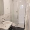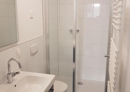 Das moderne Duschbad ist ausgestattet mit Waschtisch, Unterschrank, Lichtspiegel, bodenebener Dusche mit Echtglas-Duschabtrennung, WC, Badheizkörper.