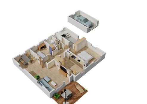•EG: Wohnzimmer, 2 Schlaf-/Kinderzimmer, Wohnküche, Bad, WC, Terrasse
