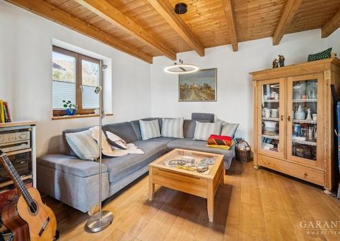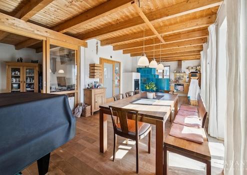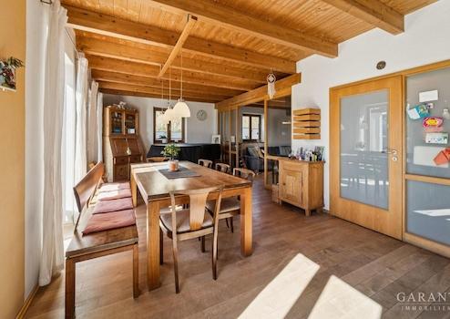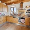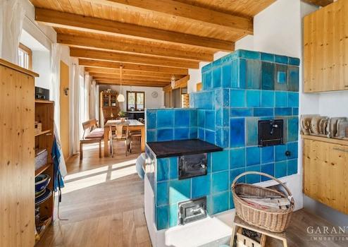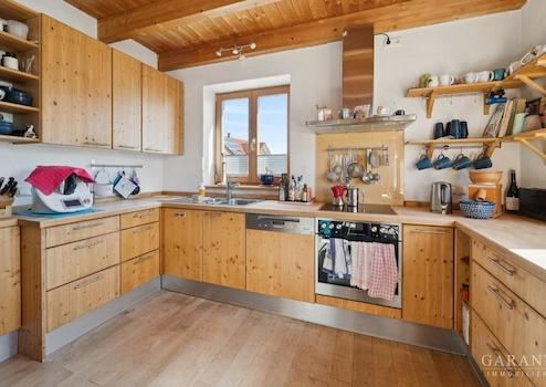 Die hochwertige Holz-Einbauküche fügt sich harmonisch in das Wohnkonzept ein. Ein besonderes Highlight ist der traditionelle Kachelofen im Küchenbereich, der nicht nur für eine angenehme Wärme sorgt, sondern auch zum Kochen und Backen genutzt werden kann.