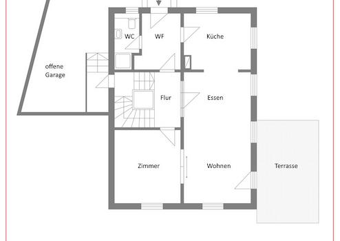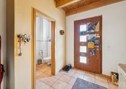 Über den Eingangsbereich gelangt man in einen Vorraum mit Gäste-WC sowie einen zentralen Flur. Von hier aus öffnet sich der helle Wohnbereich mit offener Küche, Esszimmer und Wohnzimmer.