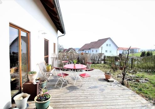 Vom Wohn- und Essbereich aus gelangt man direkt auf die großzügige ca. 50 qm große Lärchenholz-Terrasse mit optimaler Süd West-Ausrichtung, die teilweise überdacht ist und einen herrlichen Blick in den Garten und auf die angrenzenden Felder bietet.