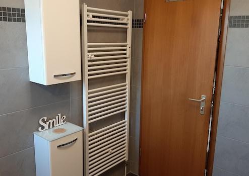 Gleich rechts ist das Duschbad, das ebenfalls in 2019 teilweise modernisiert wurde. Die Dusche und das WC samt Vorbau wurde erneuert, auch hier mit hochwertigen Grohe- Armaturen und Villeroy & Boch- WC. Unter der Dachschräge ist Platz z.B. zum Wäschetrocknen.