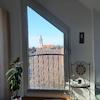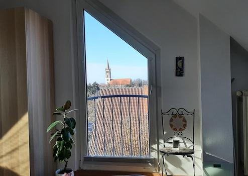 Im großen Dachzimmer ist reichlich Platz für ein großes Bett und Stauraum, durch die hohe Decke wohnt man hier luftig und hell. Dafür sorgt auch das große Giebelfenster mit schönem Fernblick plus zwei Dachfenster.