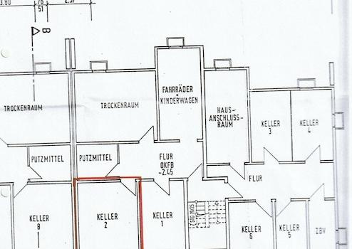 Der Keller ist 4m x 3,50m groß bei einer Höhe von 2,20m, gemeinschaftlich werden der Fahrradkeller und ein Trockenkeller genutzt.