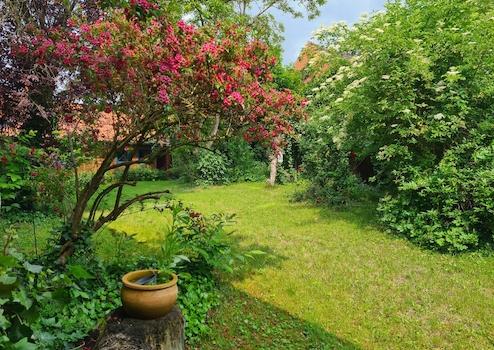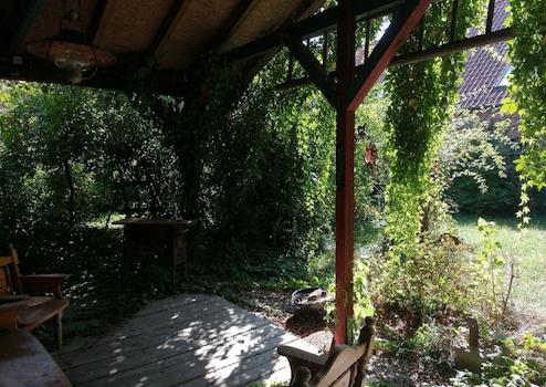 Die Immobilie besteht aus 2 großen Wohneinheiten, die entweder seperat von einander bewohnt werden können (mit jeweils eigenen Eingängen, Badezimmern und Küchen) oder auch als gemeinschaftlicher Wohnraum dienen kann. Der grüne Innenhof ist nicht einsehbar und geschützt und verfügt zudem über eine überdachte Terrasse, diese spendet im Sommer Schatten und schützt vor Regen. Zudem gibt es einen zusätzlichen Obstgarten.