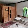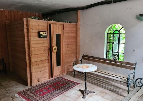 Im Gartenbereich befindet sich eine Sauna.