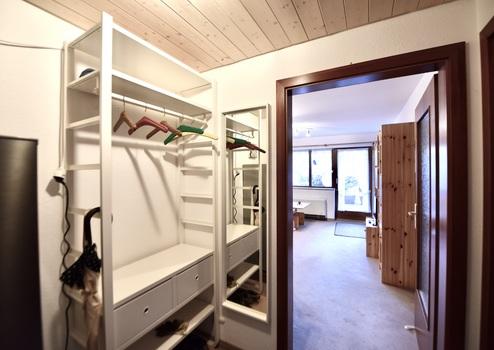 Die Terrassen Wohnung ist im Allgäuer Landhausstil möbliert, es gibt eine Einbauküche mit Backofen und Ceranfeld, eine Spülmaschine sowie eine Kühl- und Gefrierkombination die im Flur neben der garderobe steht, ein Schlafzimmer mit Doppelbett und Schrank, sowie ein Wannenbad mit Glaswand zum Duschen und eingebautem Spiegelschrank.