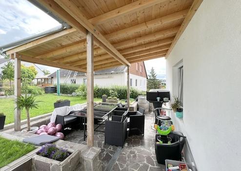 Auch der Außenbereich überzeugt mit vielfältigen Nutzungsmöglichkeiten. Der Garten lädt zum Entspannen ein und wird durch eine überdachte Terrasse ergänzt – ideal für gesellige Stunden im Freien.