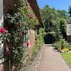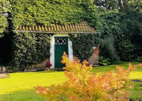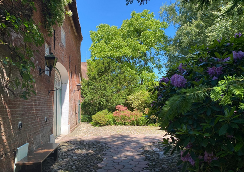 Wunderschöne Außenflächen mit altem Baumbestand, gepflegtem Rasen und Beeten, ruhigen Sitzecken im geschützten Innenhof