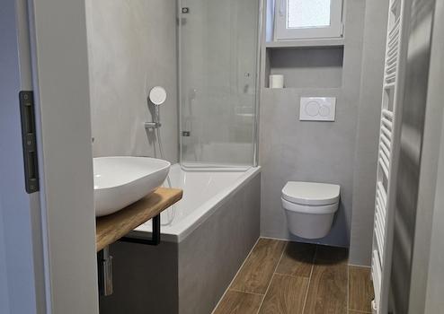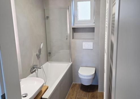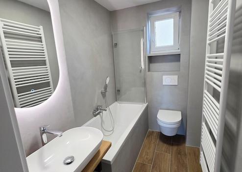 Renoviert wurden auch alle Elektro- und Installationsleitungen, Bad wurde mit moderner fugenloser Mikrozementtechnik gemacht.