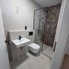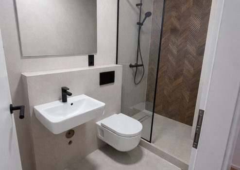 Das moderne Badezimmer ist stilvoll gestaltet und verfügt über eine bodengleiche Walk-In-Dusche, hochwertige Armaturen sowie eine harmonische Kombination aus hellen Materialien und modernen Akzenten.