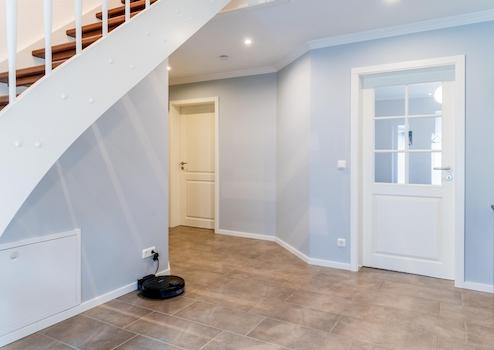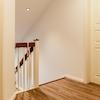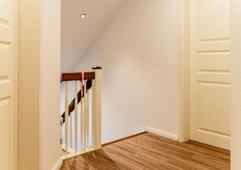Die Vollholztreppe in das nachträglich ausgebaute Dachgeschoss fügt sich ideal ein und verleiht dem Flur eine angenehme Atmosphäre.
