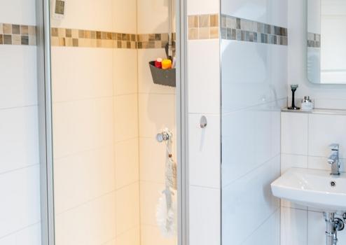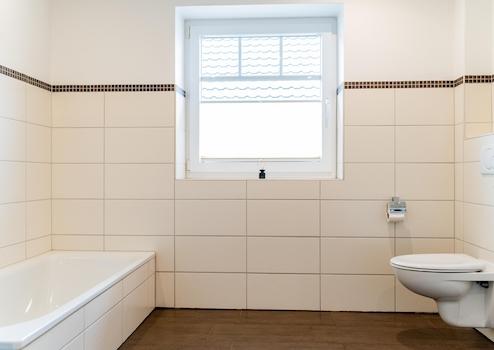 Das Badezimmer im Erdgeschoss ist räumlich ideal aufgeteilt. Eine Badewanne und eine Dusche setzen perfekte Highlights.