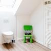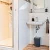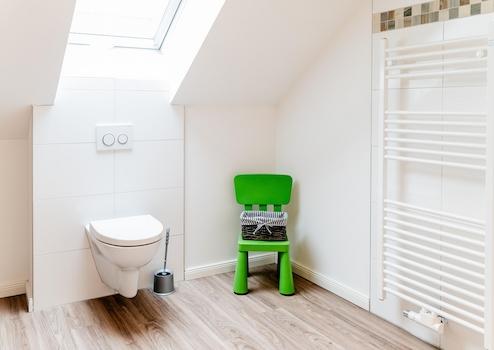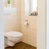 Die Badezimmer verfügen allesamt über WC mit Wandmontage. Im unteren Badezimmer ist ein breites Waschbecken und Unterschrank vorhanden.
