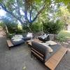 • Tisch und 6 Stühle im Freien mit Sonnenschirm