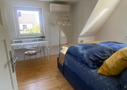 • Schlafzimmer 1 mit Doppelbett 180x200, Schreibtisch mit Stuhl, Spiegel, Kleiderschrank und Kleiderbügel