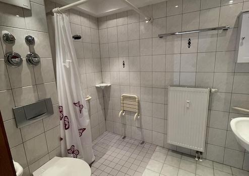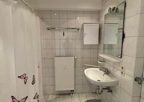 5) Badezimmer: Hell gefliestes Badezimmer mit Dusche und WC und Installationsmöglichkeit für eine Waschmaschine (zusätzlicher Waschmaschinen-Platz im Keller vorhanden).