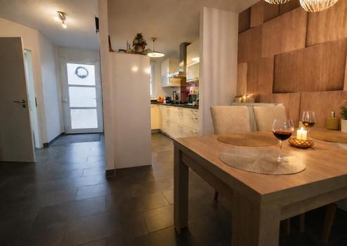 Bereits beim Betreten des Hauses vermittelt der Eingangsbereich ein angenehmes Wohngefühl. Im Erdgeschoss befinden sich eine moderne Küche sowie das großzügige Wohn- und Esszimmer. Große Fensterflächen sorgen für eine helle und freundliche Atmosphäre. Vom Wohnbereich aus gelangen Sie direkt auf die überdachte Terrasse –