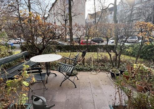 Wenn man hinten aus der Küche tritt, kommt man über einen Wirtschaftsbalkon in den Hofgarten mit einer kleinen Terrasse, der auch bei großer Hitze eine angenehme Kühle bewahrt - eine kleine Großstadtoase.