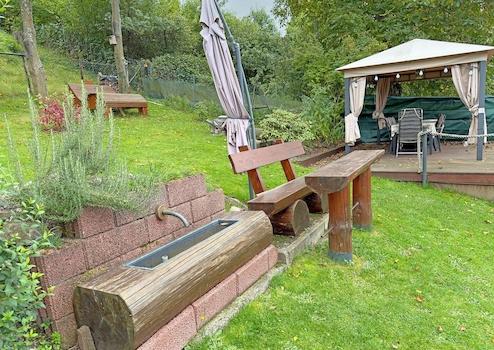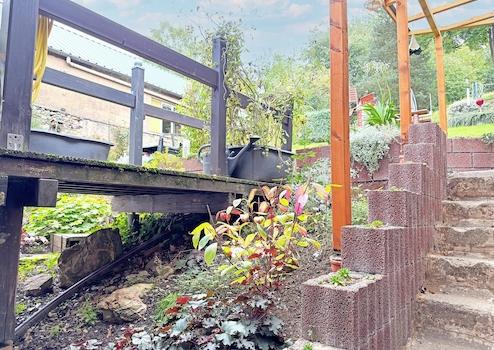 Ein echtes Highlight des Hauses ist der Garten in leichter Hanglage mit Terrasse und Teich, der zusätzlichen Platz im Freien bietet und vielfältige Nutzungsmöglichkeiten eröffnet.