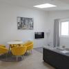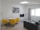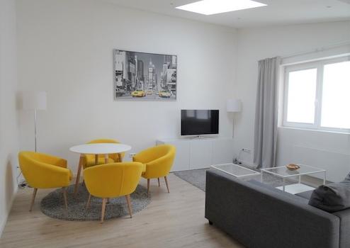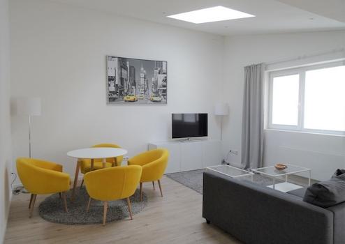 Zu dem Apartment zählen ein helles, modern eingerichtetes Wohnzimmer mit Couch- und Essbereich, sowie ein Schlafzimmer mit großem Bett (160x200cm), Schrank und Arbeitsbereich.