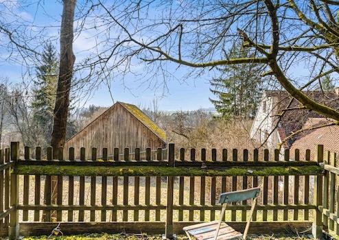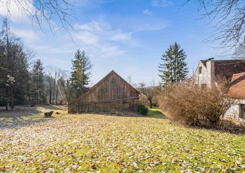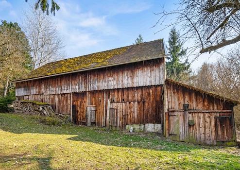 Auf dem idyllischen Anwesen befindet sich neben dem historischen Wohnhaus ein kleines Nebengebäude mit Hobbyraum, eine große Scheune und ein Außenkeller mit Panoramaterrasse.