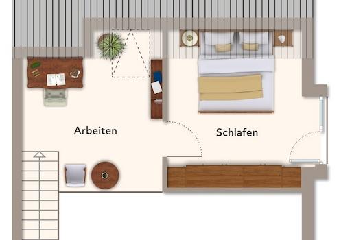 Die Maisonette erstreckt sich über zwei Ebenen im Dachgeschoss und bietet ein exquisites Wohnerlebnis. Auf der ersten Ebene befinden sich ein geräumiges Wohnzimmer mit beeindruckender Deckenhöhe bis in den Giebel, eine separate Küche, ein modern ausgestattetes Badezimmer mit Wanne und Dusche sowie ein herrlichen Balkon für gemütliche Stunden unter freiem Himmel.
