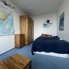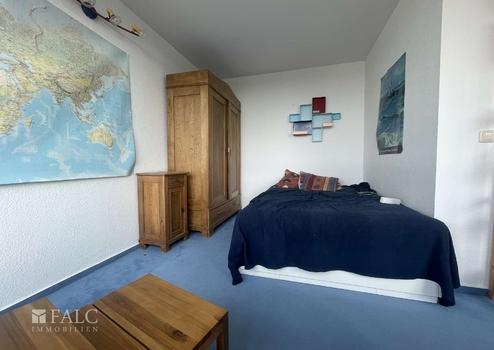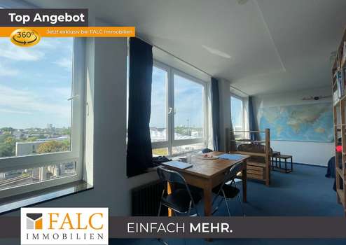 Der Rundgang führt weiter in den Wohn- und Schlafraum. Der Raum wirkt durch die breite Fensterfront deutlich größer als die m² vermuten lässt. Mehrere große Fenster bringen viel Tageslicht hinein und eröffnen einen weiten Blick, da sich die Wohnung in einer oberen Etage befindet. Der Boden ist mit einem textilen Belag ausgestattet, der den Raum wohnlich wirken lässt. Die längliche Raumform ermöglicht eine gute Zonierung: vorne ein Ess- oder Arbeitsbereich am Fenster, dahinter der Schlafbereich, ergänzt durch Regale oder einen Kleiderschrank.