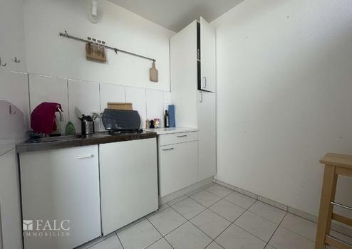 Daneben befindet sich die separate Küche. Auch hier sind Boden- und Arbeitsbereich gefliest. Die Küchenzeile bietet Stauraum in Unter- und Oberschränken sowie eine durchgehende Arbeitsfläche mit Spüle. Durch die Abtrennung vom Wohnraum bleibt Kochen und Wohnen sauber getrennt, was in dieser Wohnungsgröße ein praktischer Vorteil ist.