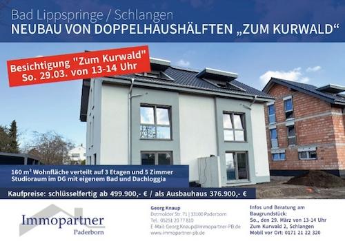 Diese Neubau-Doppelhaushälften befinden sich in Bad Lippspringe / Schlangen, Zum Kurwald / Ecke Paderborner Straße einer ruhigen und familienfreundlichen Wohnlage.