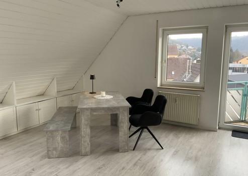 Eine schöne moderne Einbauküche, sowie die Esszimmer Gruppe in Steinoptik, kleine Bistrositzgruppe für einen gemütlichen Kaffee mit Blick auf das Kochtal sind inklusive. Es wurden von einem Schreiner Einbauschränke im unteren Wohnbereich, sowie auch im Dachgeschoss angefertigt, so dass man wirklich nur noch eine Couch und ein bequemes Bett bräuchte.