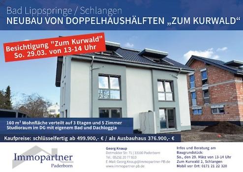 Diese Neubau-Doppelhaushälften befinden sich in Bad Lippspringe / Schlangen, Zum Kurwald / Ecke Paderborner Straße einer ruhigen und familienfreundlichen Wohnlage.