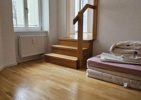 Aus dem Wohnbereich kommt man über eine 3-stufige Treppe in das Schlafzimmer. Durch die so geschaffene Split-Level Lösung wirkt die Wohnung deutlich größer als die ausgemessenen 45 qm. Zudem kommt über die vier nach Südwesten ausgerichteten Fenster sehr viel Licht in die Wohnung. Die Kombination aus viel Licht und Split-Level lässt eine sehr angenehme Wohnatmosphäre entstehen.