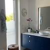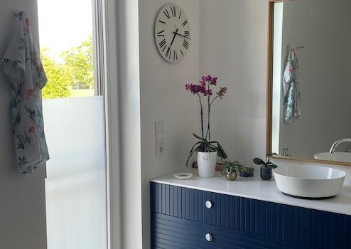 Im Obergeschoss befinden sich zwei großzügige Schlafzimmer, eines davon mit Zugang zum südwestlich ausgerichteten Balkon. Ergänzt wird diese Etage durch ein geräumiges Badezimmer mit bodengleicher, großer Dusche, Badewanne sowie zwei Waschbecken und einem hochwertigen, großen Einbauwaschtischunterschrank.