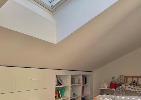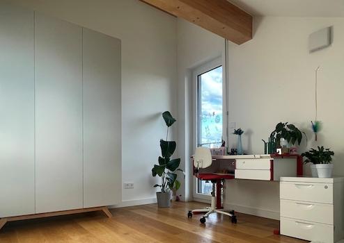 Das ausgebaute Dachgeschoss bietet zwei weitere helle und gut geschnittene Zimmer mit großzügiger Raumhöhe, die sich flexibel als Schlaf-, Arbeits- oder Gästezimmer nutzen lassen. In einem der Räume sorgen maßgefertigte, hochwertige Schrankeinbauten für eine optimale Nutzung der Dachschrägen.