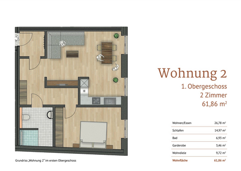 Die Wohnung Nummer 2 bietet auf 61,86 m² eine durchdachte Aufteilung mit zwei Zimmern und moderner Gestaltung: